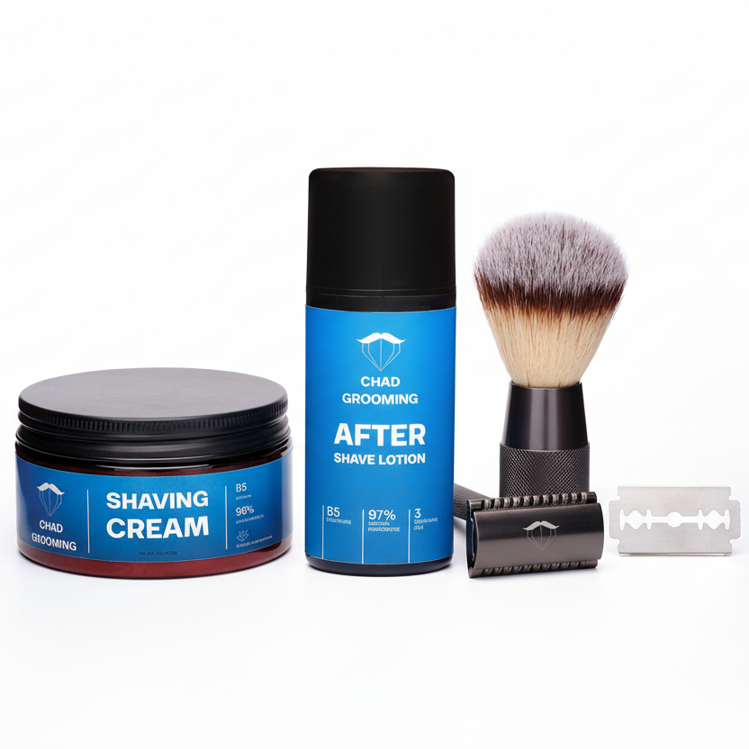 Shaving Cream-ið frá Chad Grooming er 96,15% náttúrulegt sem er frábært fyrir húðina og safety razor rakvélablaðið í Obsidian rakvélinni hjálpar þér að ná hárunum betur. Hárin í Vellum Rakburstinn hjálpa einnig að gera húðina tilbúna fyrir raksturinn. After Shave-ið kælir þig svo niður eftir átökin!